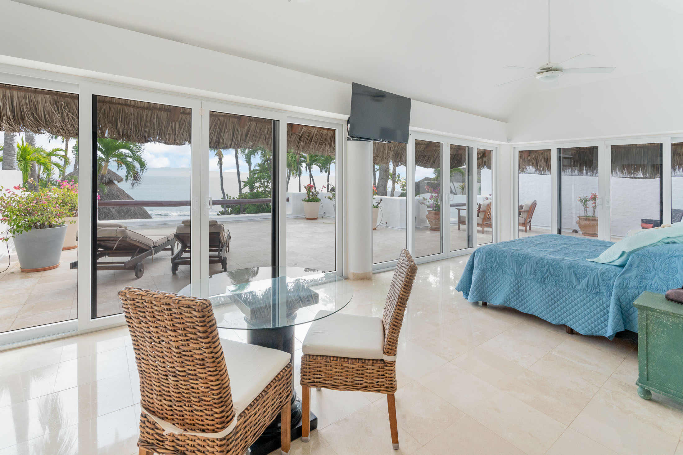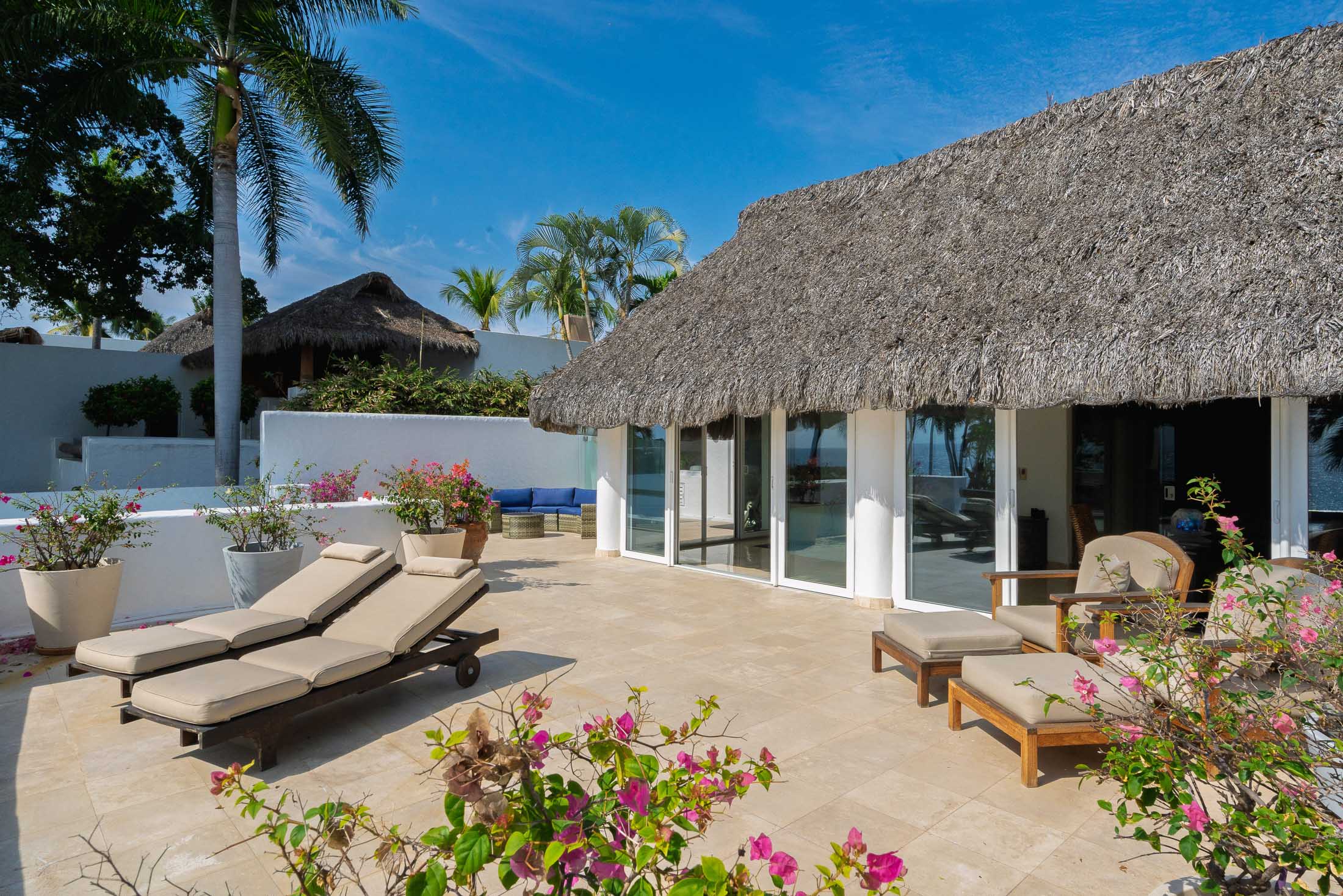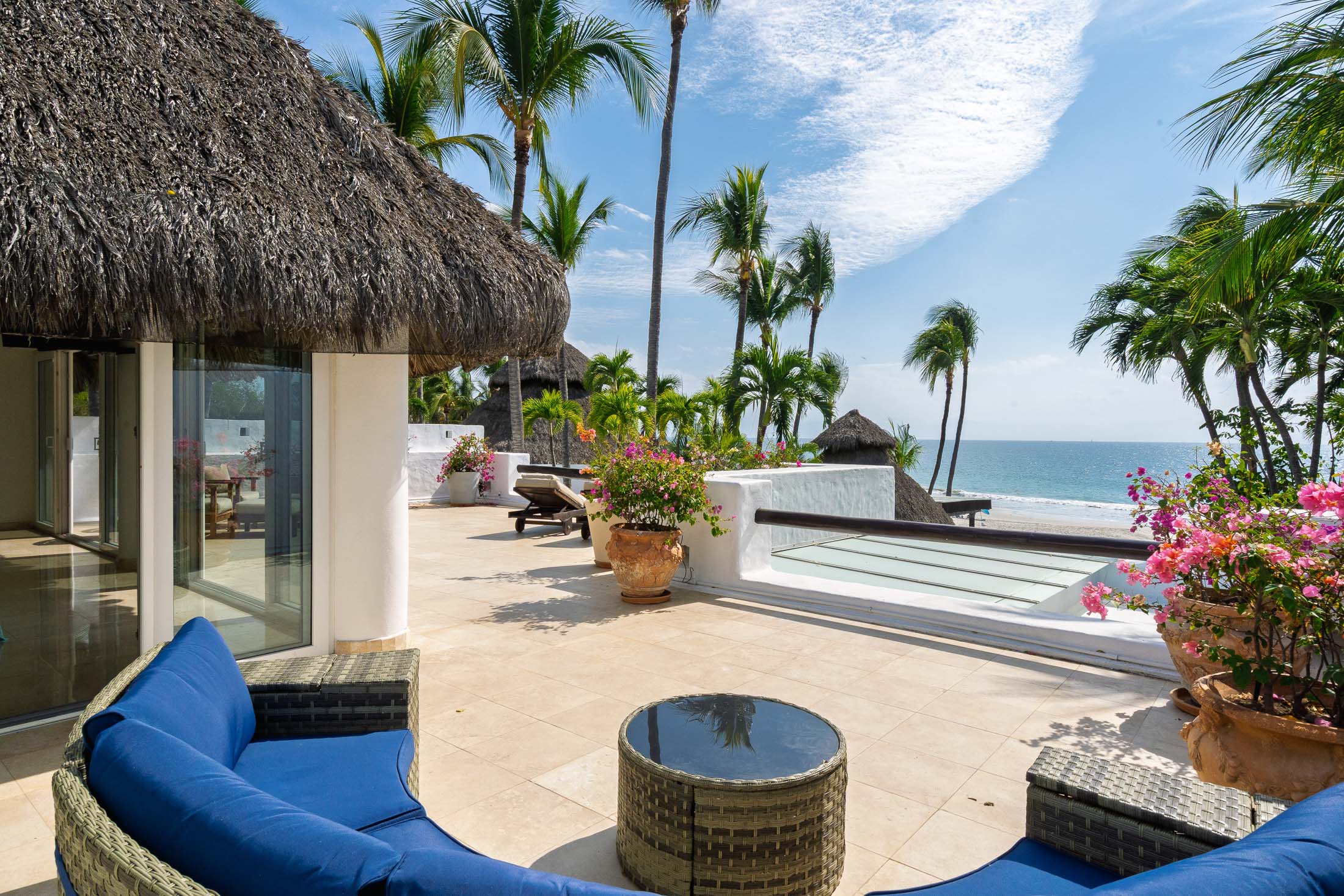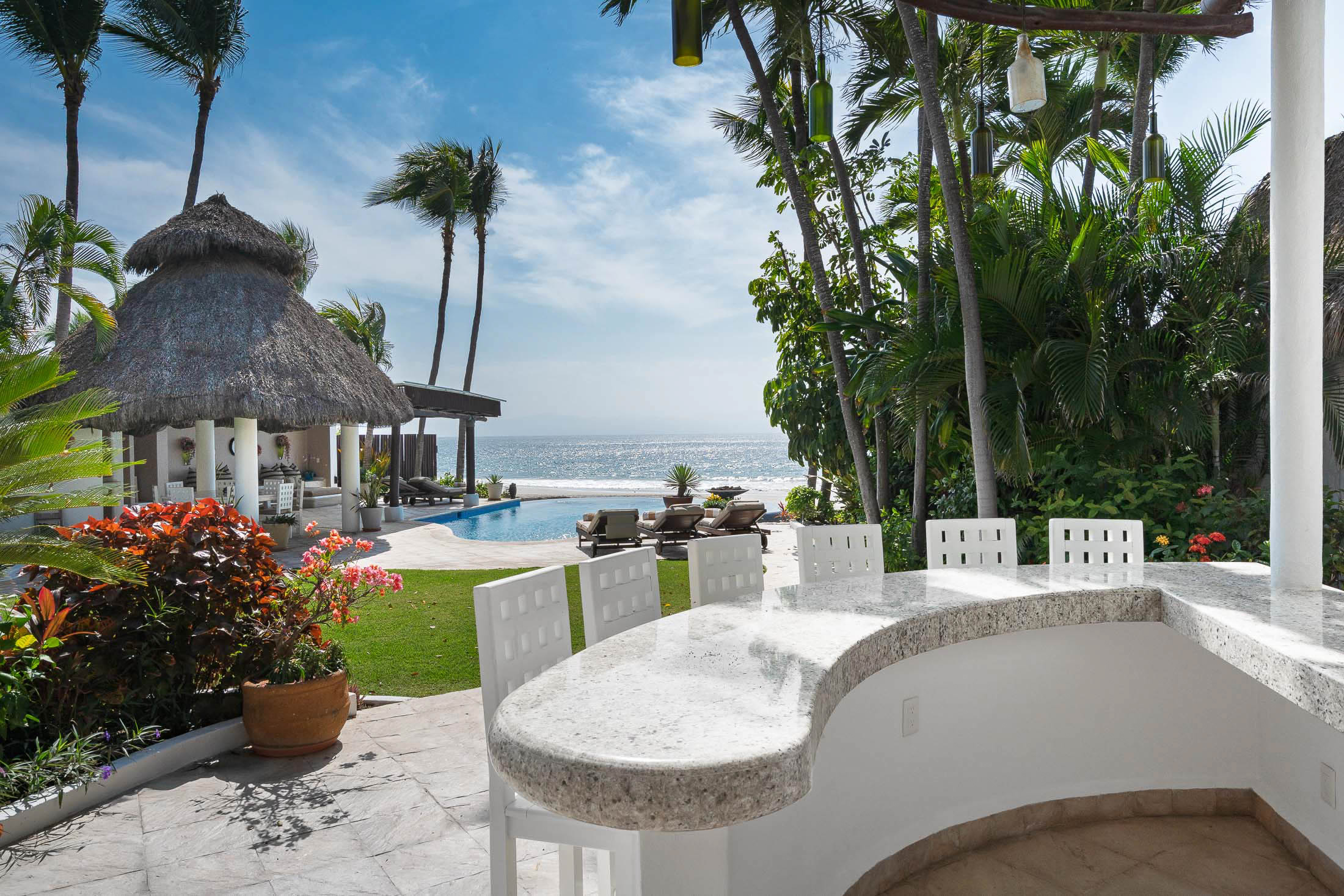 This spacious home features an open floor plan with great room living, dining and kitchen all overlooking a wall of retractable glass doors that lead out to a private, outdoor oceanfront oasis. Exterior entertaining area is complete with a 10-person covered palapa dining, pool cabana with shower, separate outdoor bar and barbeque area overlooking the tiled infinity pool. Views extend outward over the fine sandy beach, and iridescent blue ocean, all framed by the Sierra Madre mountains across the bay including a view to the Las Marieteas Islands.