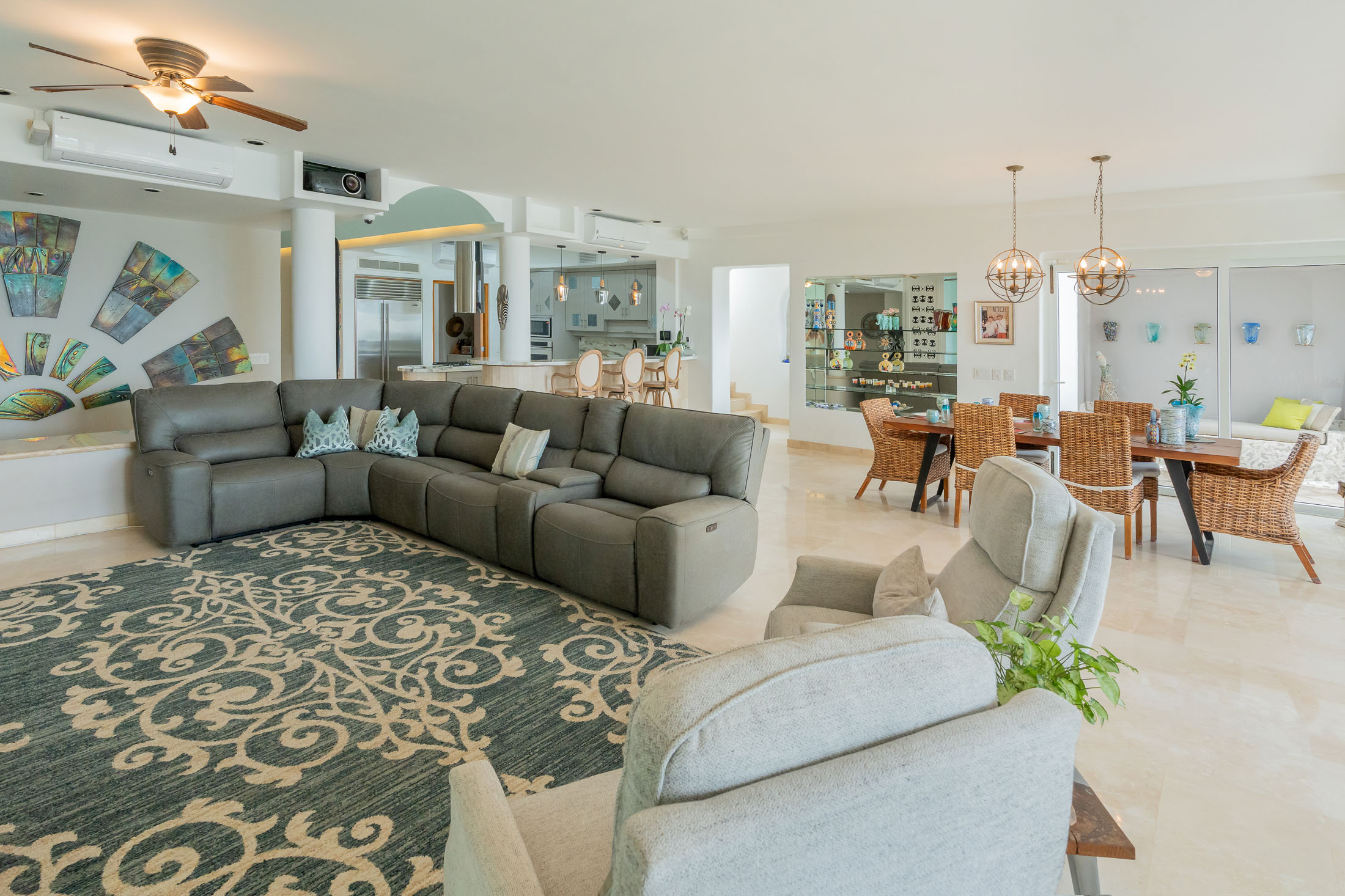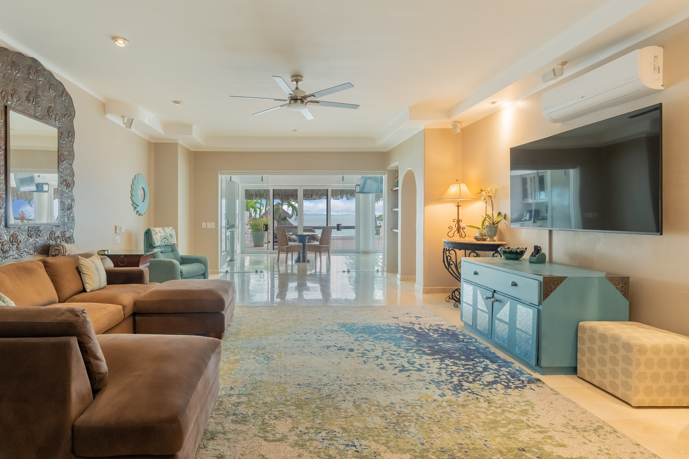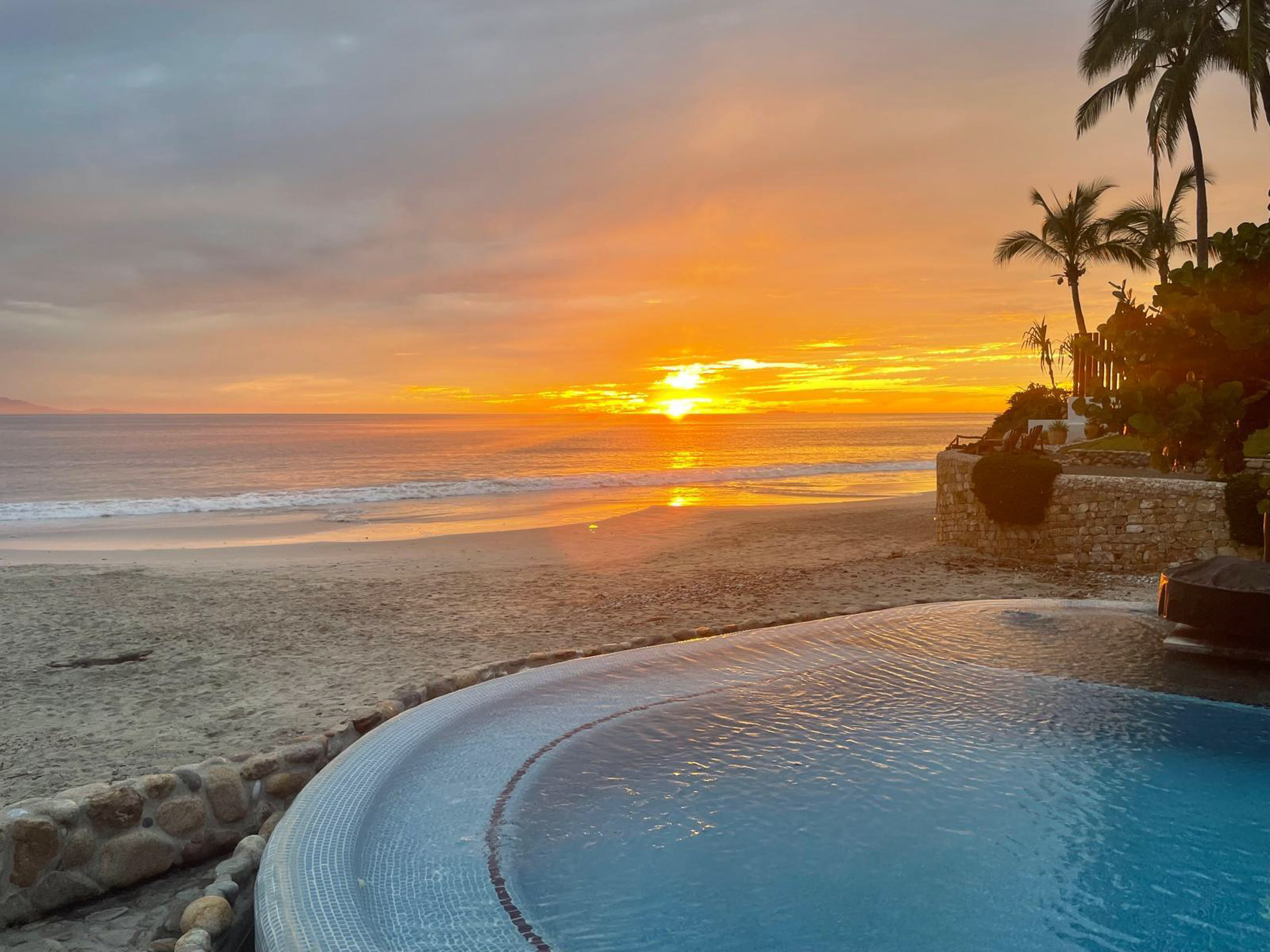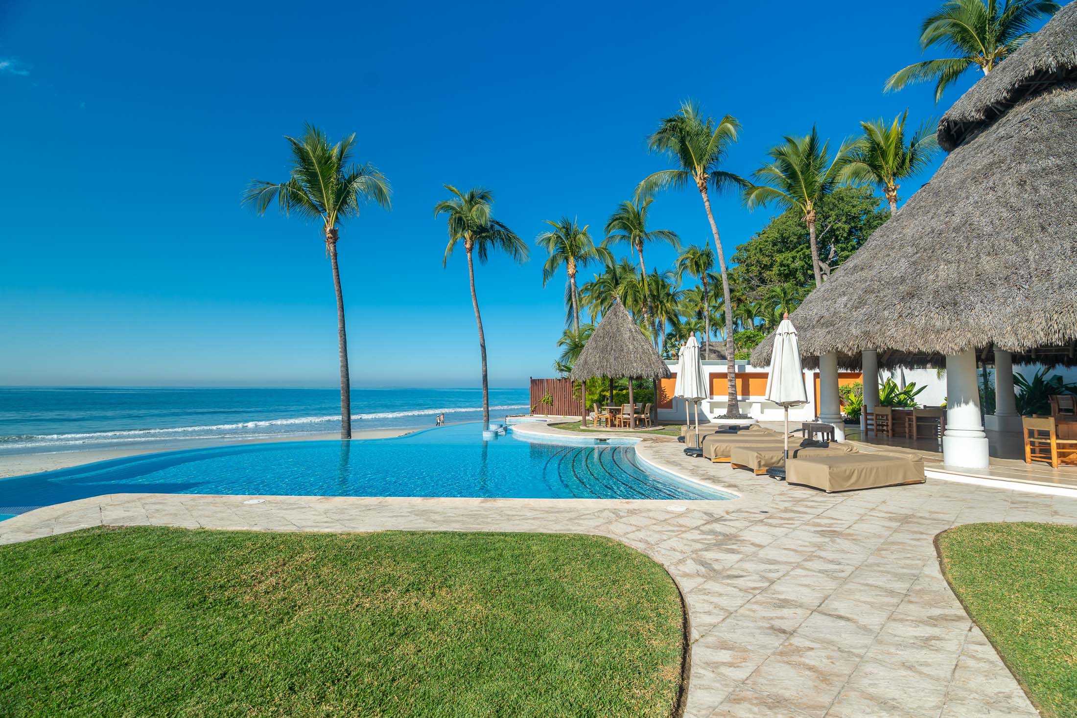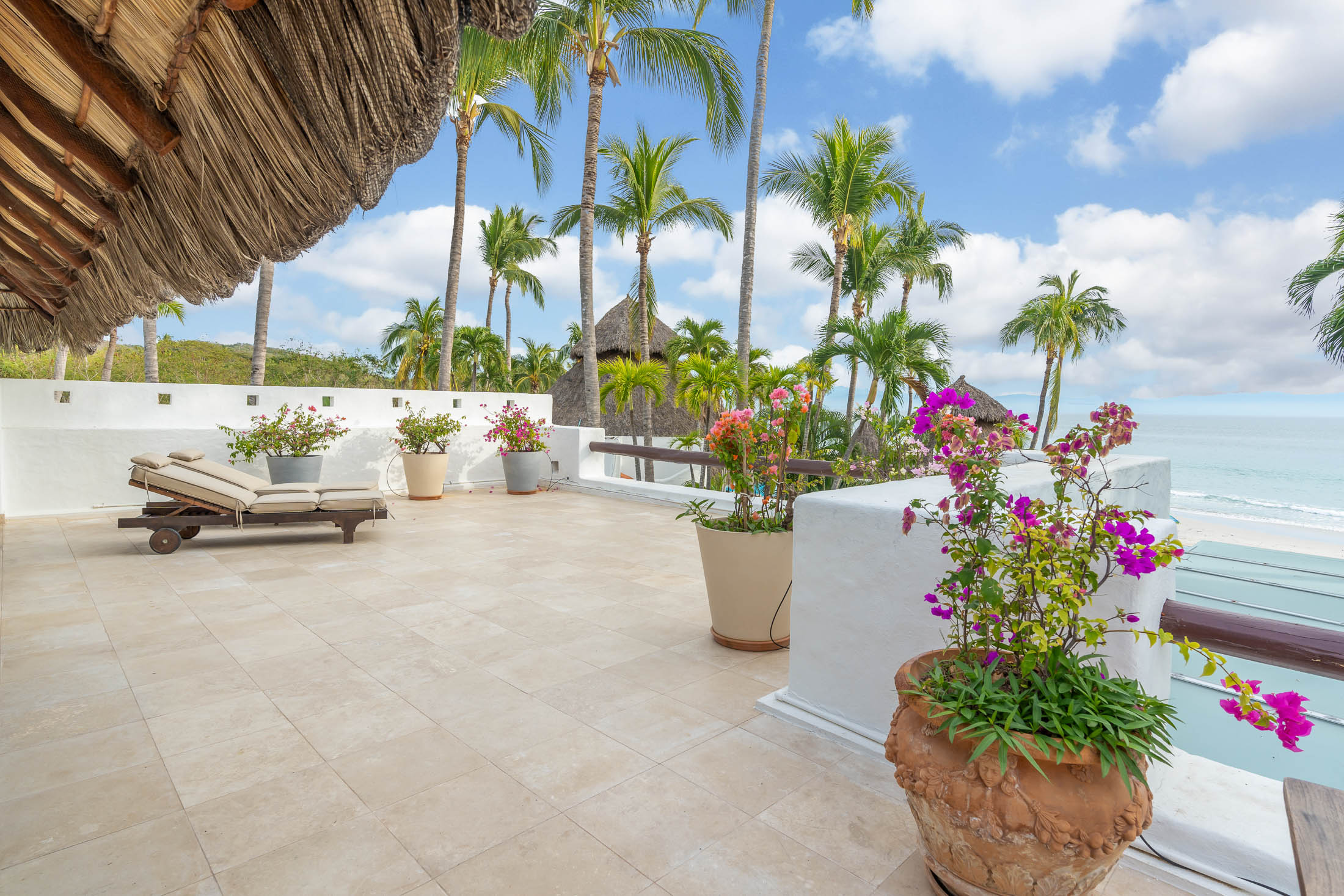 This spacious home features an open floor plan with great room living, dining and kitchen all overlooking a wall of retractable glass doors that lead out to a private, outdoor oceanfront oasis. Exterior entertaining area is complete with a 10-person covered palapa dining, pool cabana with shower, separate outdoor bar and barbeque area overlooking the tiled infinity pool. Views extend outward over the fine sandy beach, and iridescent blue ocean, all framed by the Sierra Madre mountains across the bay including a view to the Las Marieteas Islands.