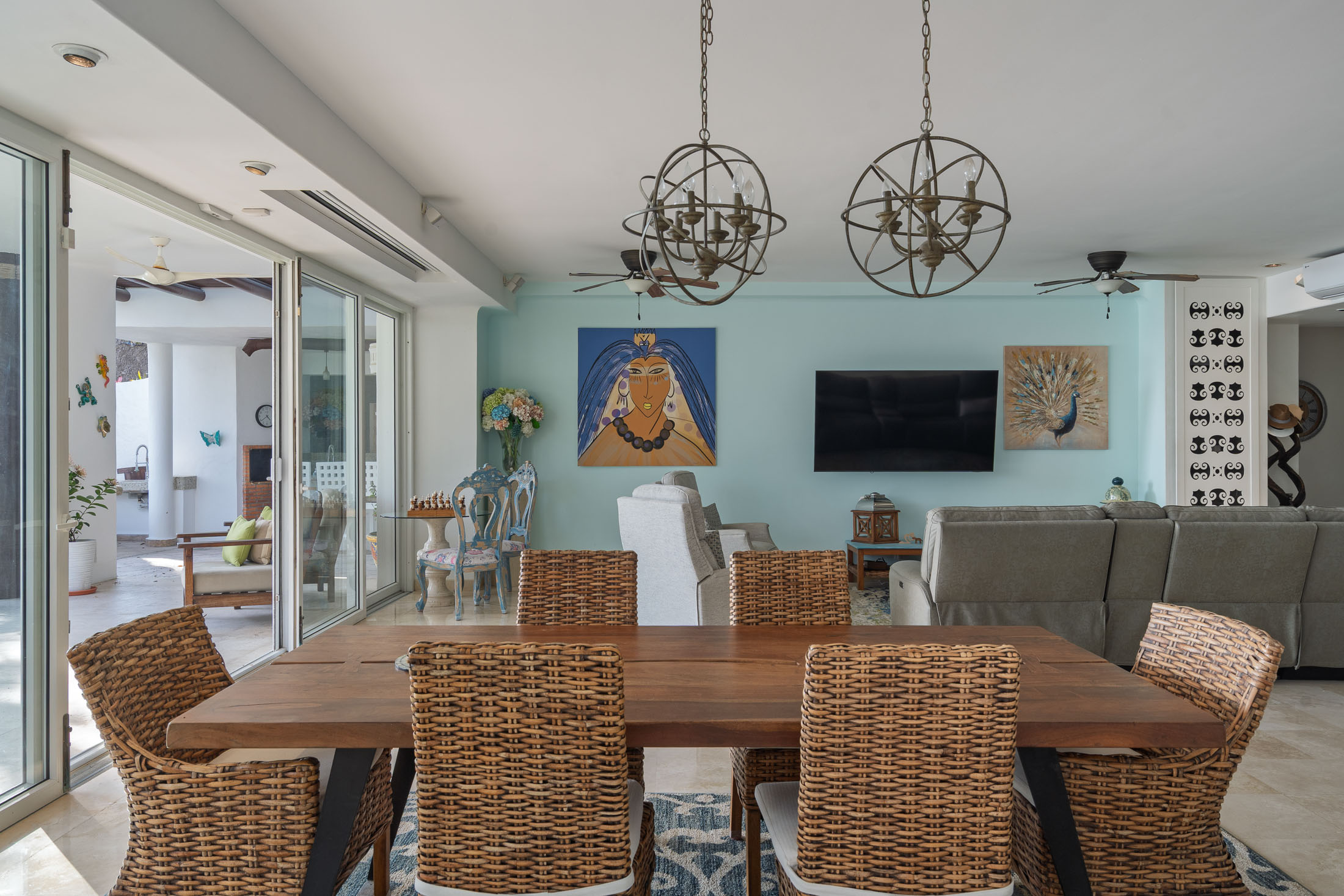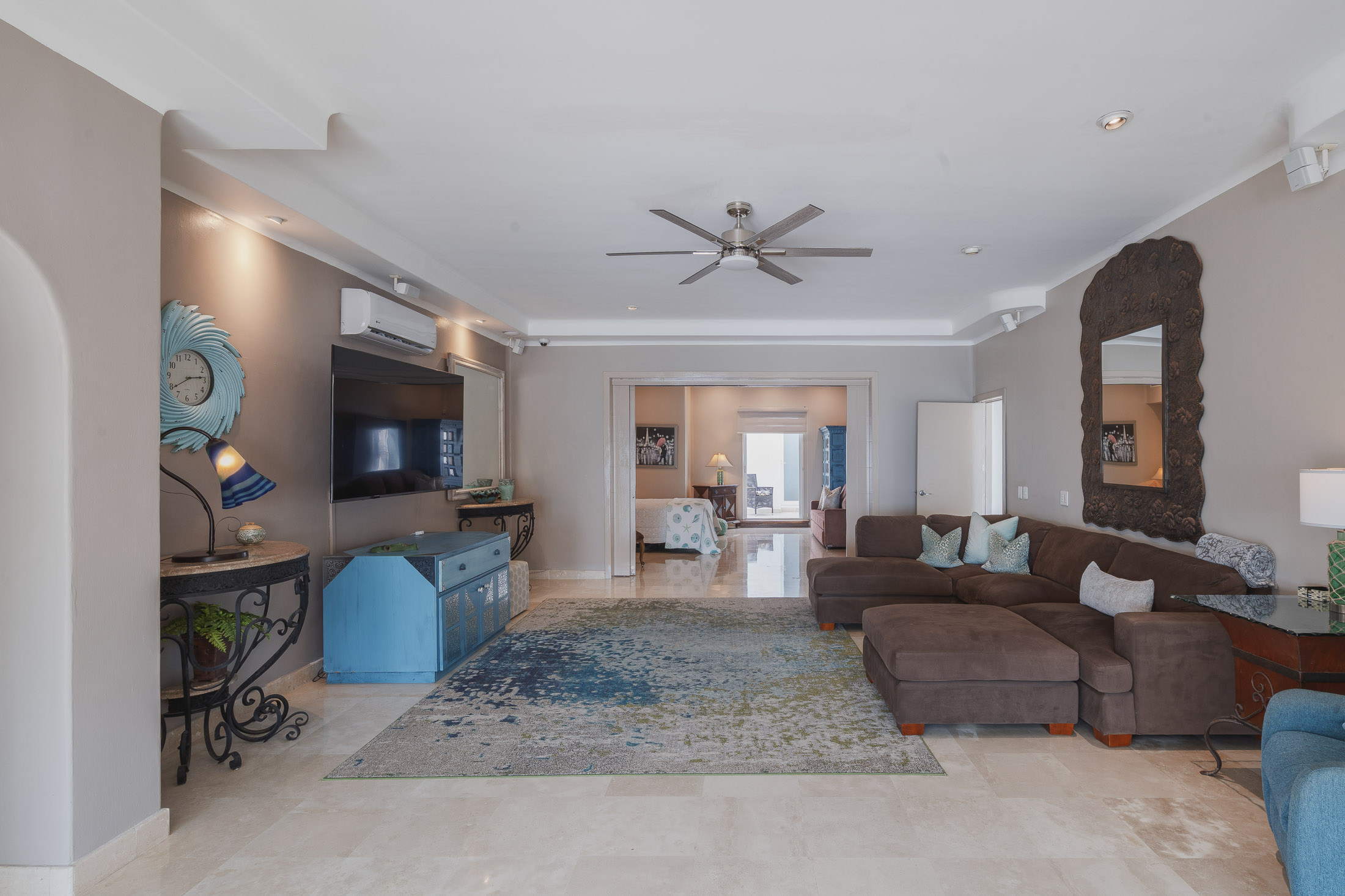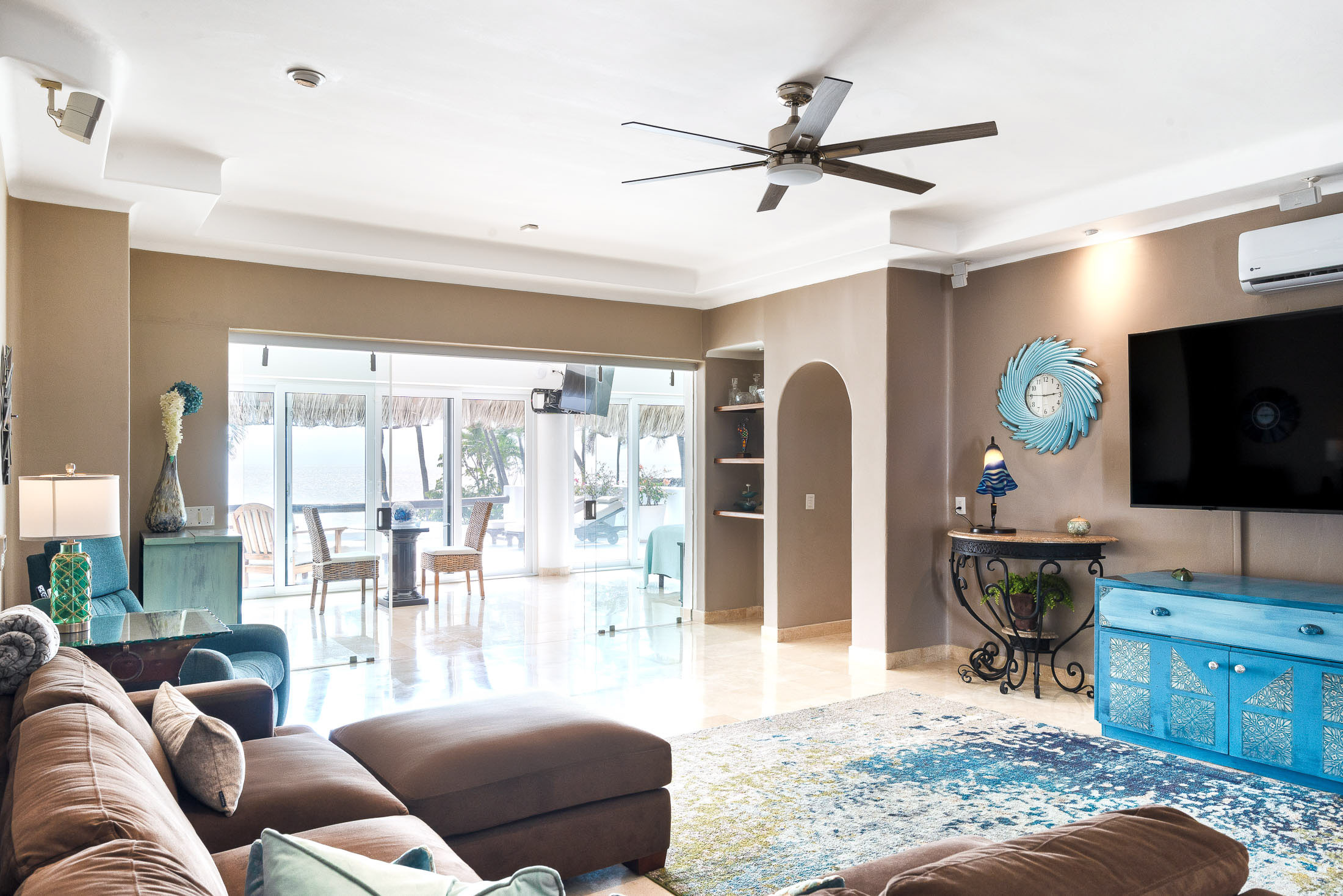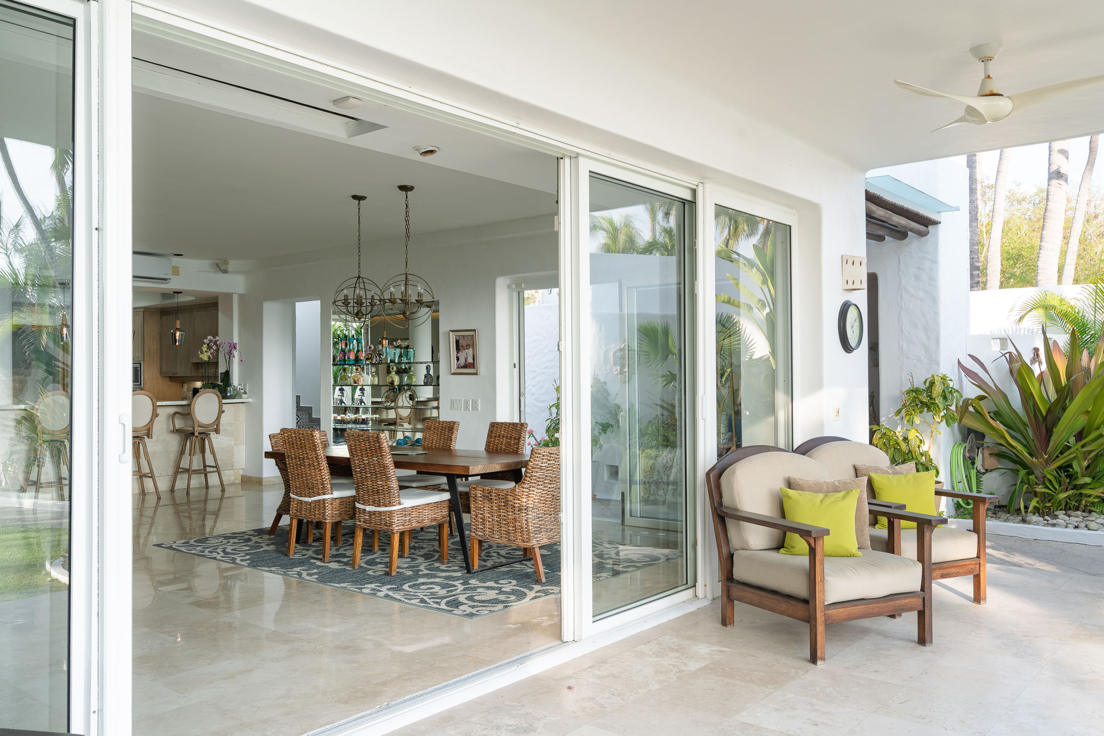 This spacious home features an open floor plan with great room living, dining and kitchen all overlooking a wall of retractable glass doors that lead out to a private, outdoor oceanfront oasis. Exterior entertaining area is complete with a 10-person covered palapa dining, pool cabana with shower, separate outdoor bar and barbeque area overlooking the tiled infinity pool. Views extend outward over the fine sandy beach, and iridescent blue ocean, all framed by the Sierra Madre mountains across the bay including a view to the Las Marieteas Islands.