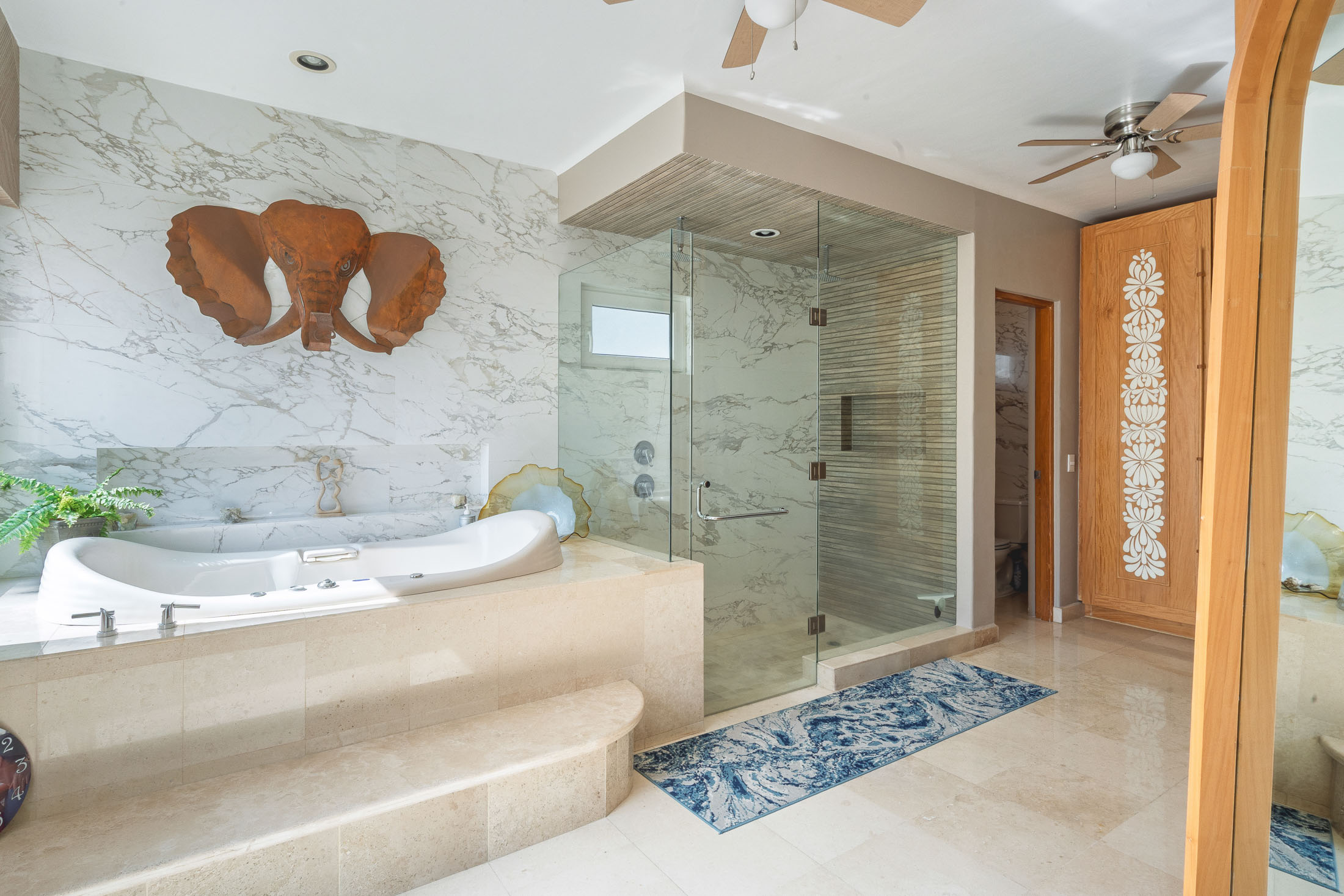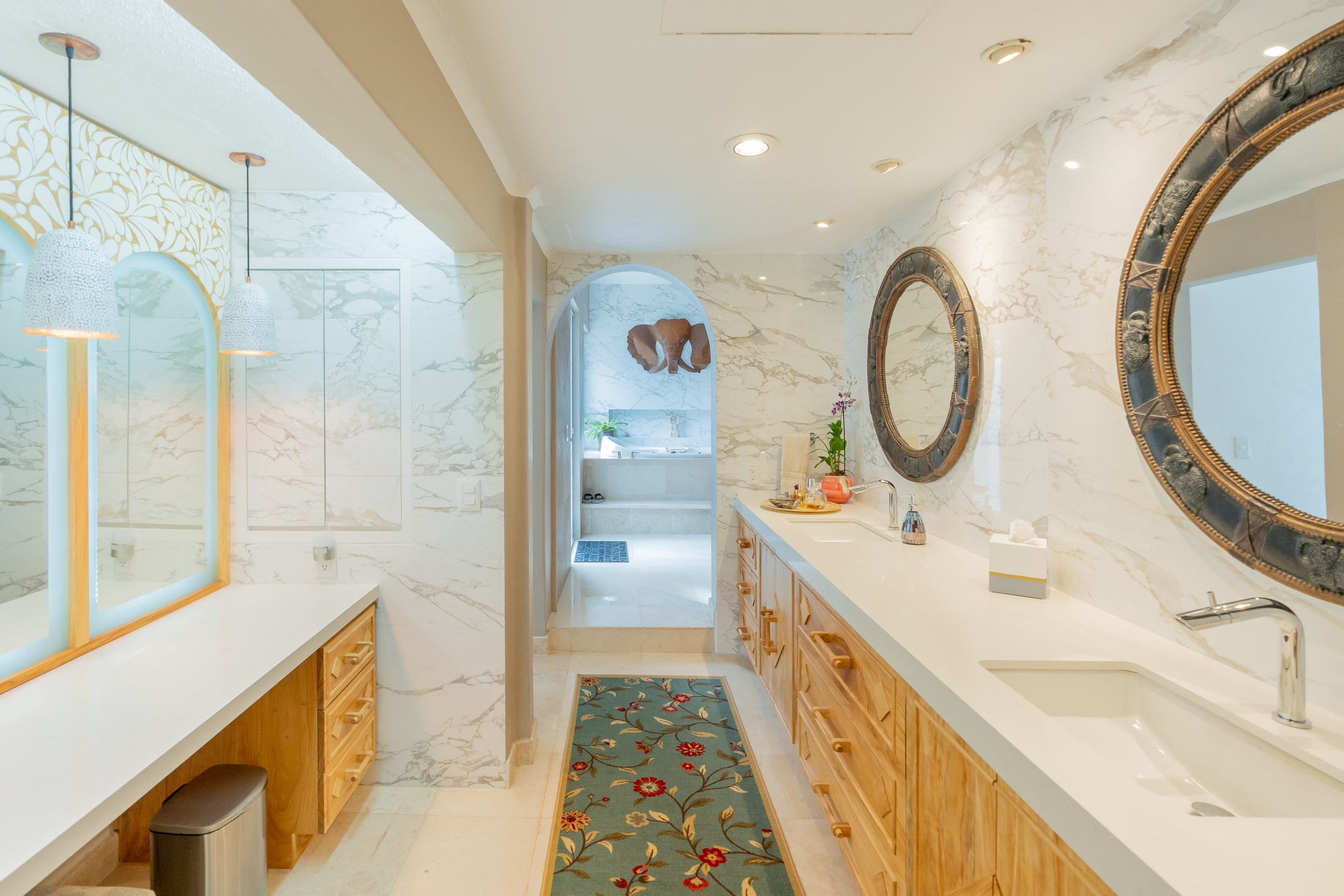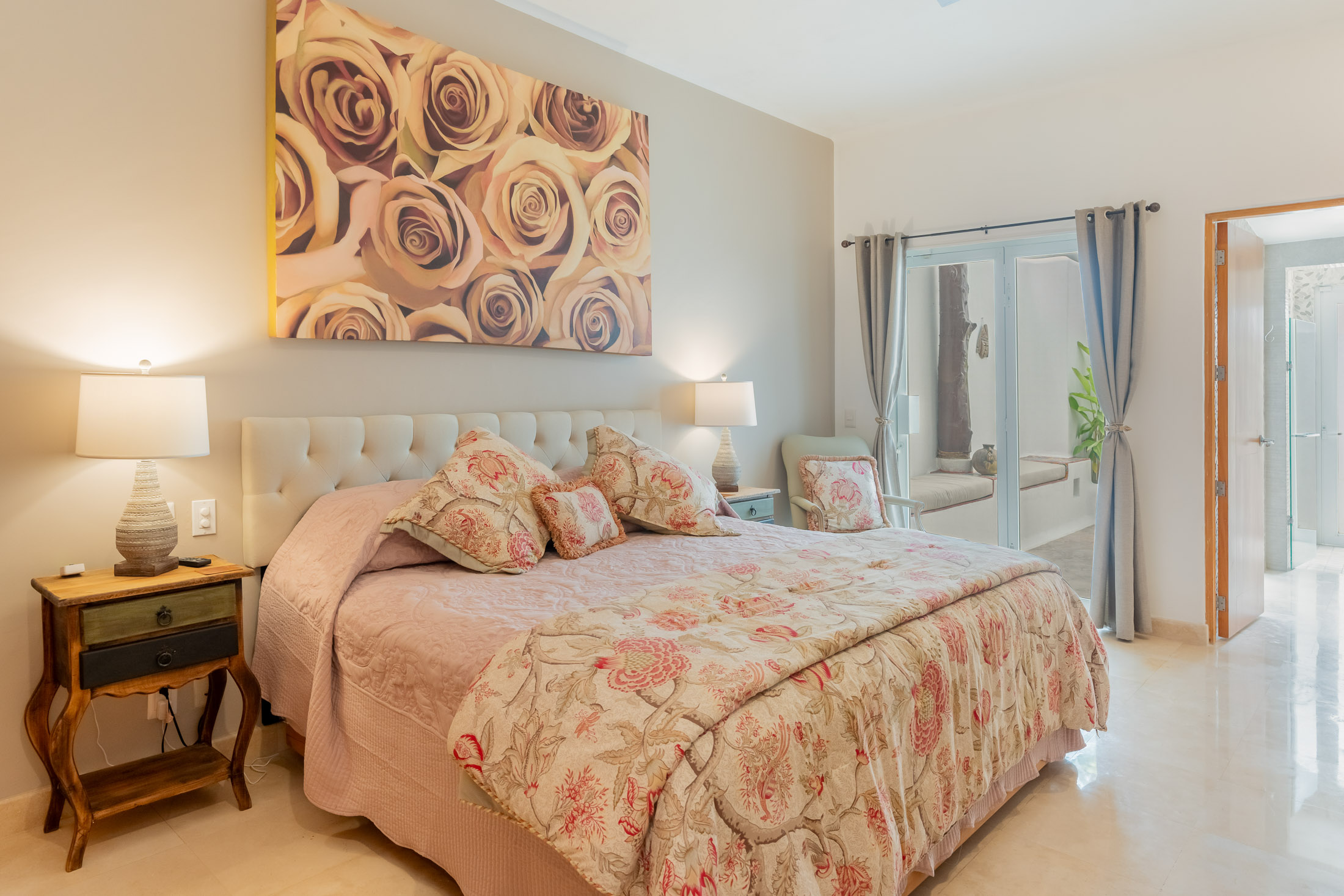 • BEDROOM #1”: Spacious Guest Master Suite with Private Courtyard, 2 Large beds, twin sinks, indoor & outdoor shower, custom tiled benches, stained glass