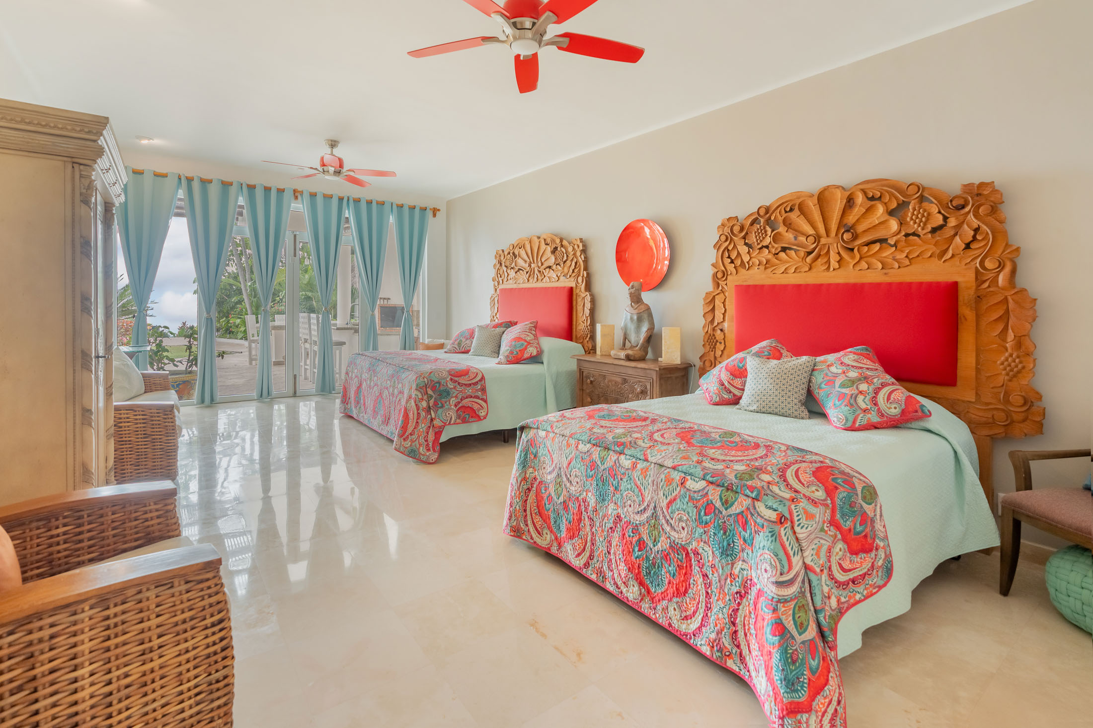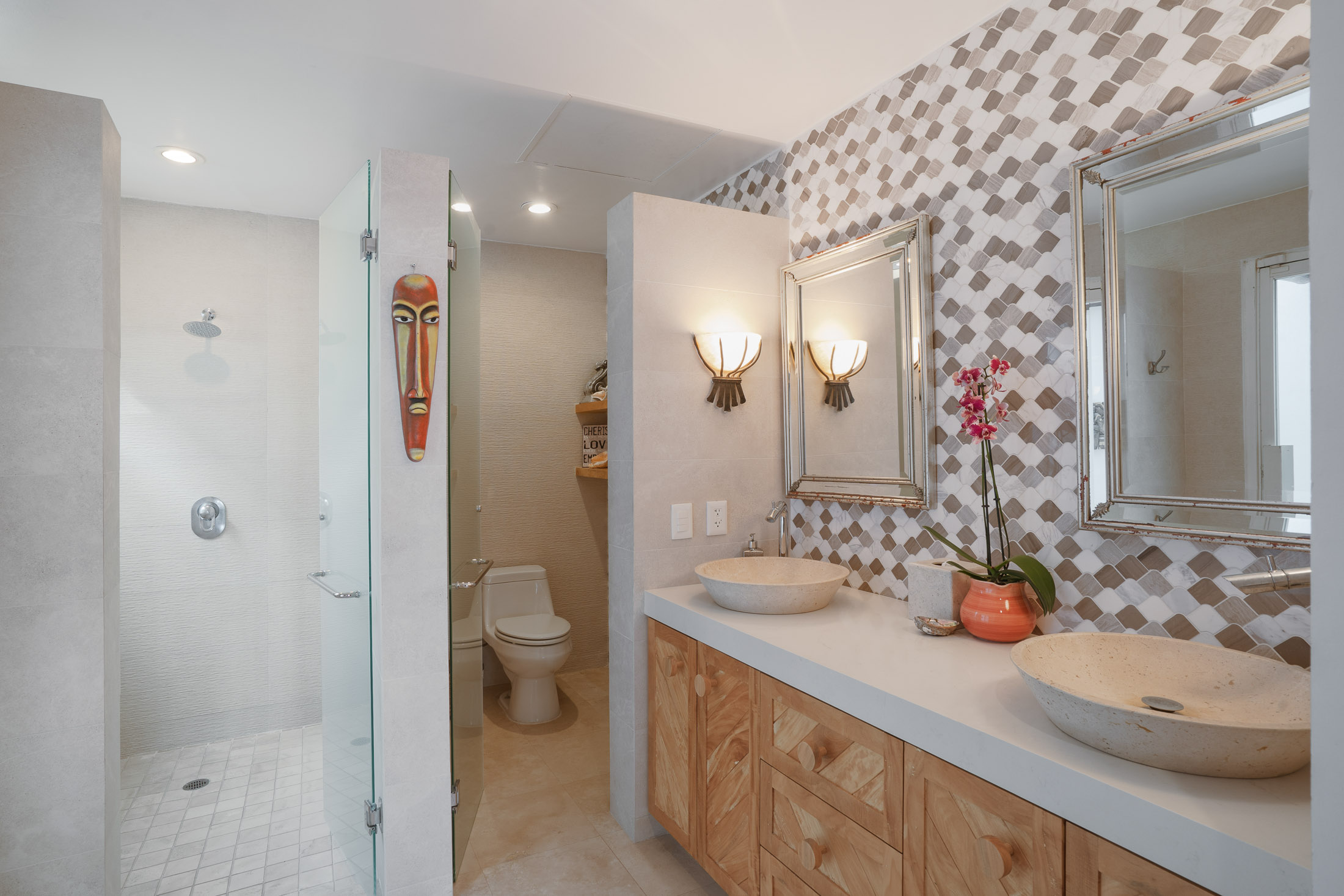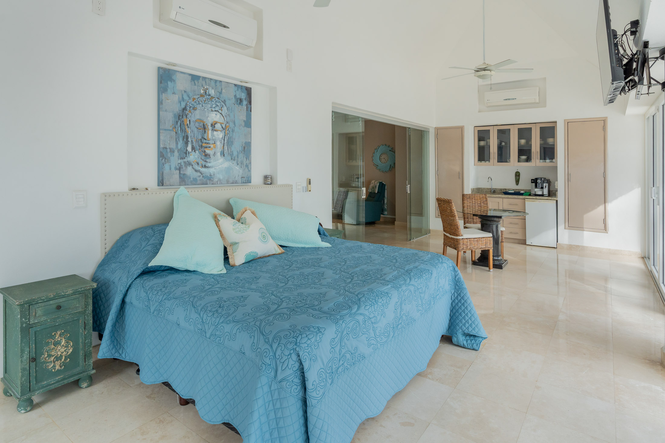 • BEDROOM #1”: Spacious Guest Master Suite with Private Courtyard, 2 Large beds, twin sinks, indoor & outdoor shower, custom tiled benches, stained glass