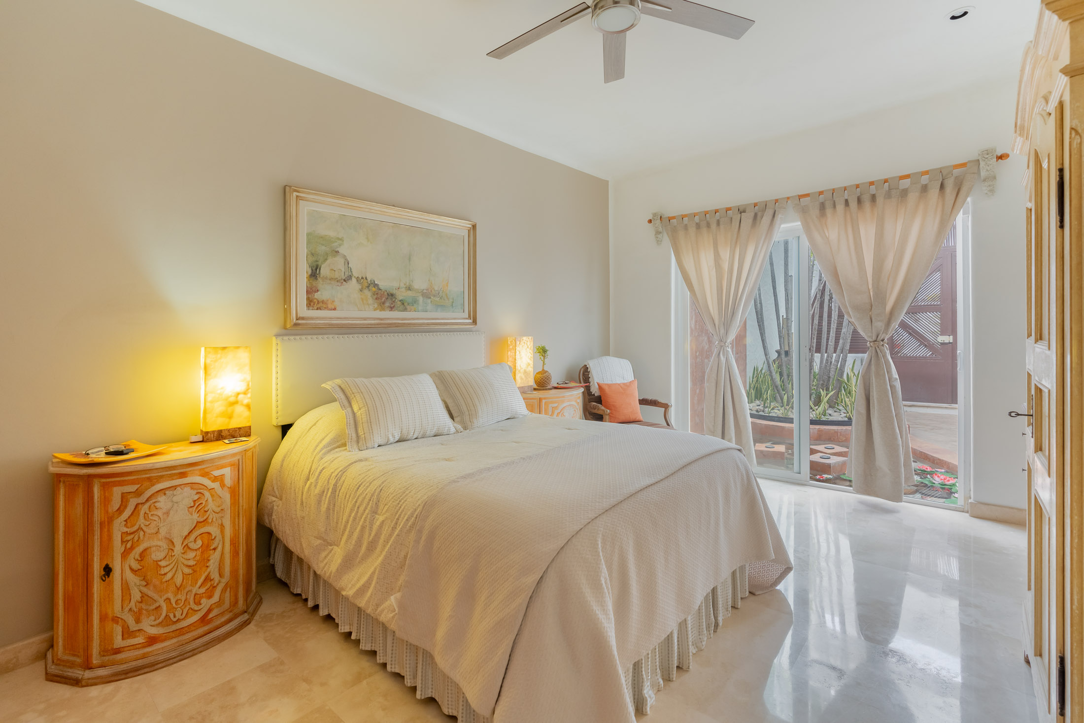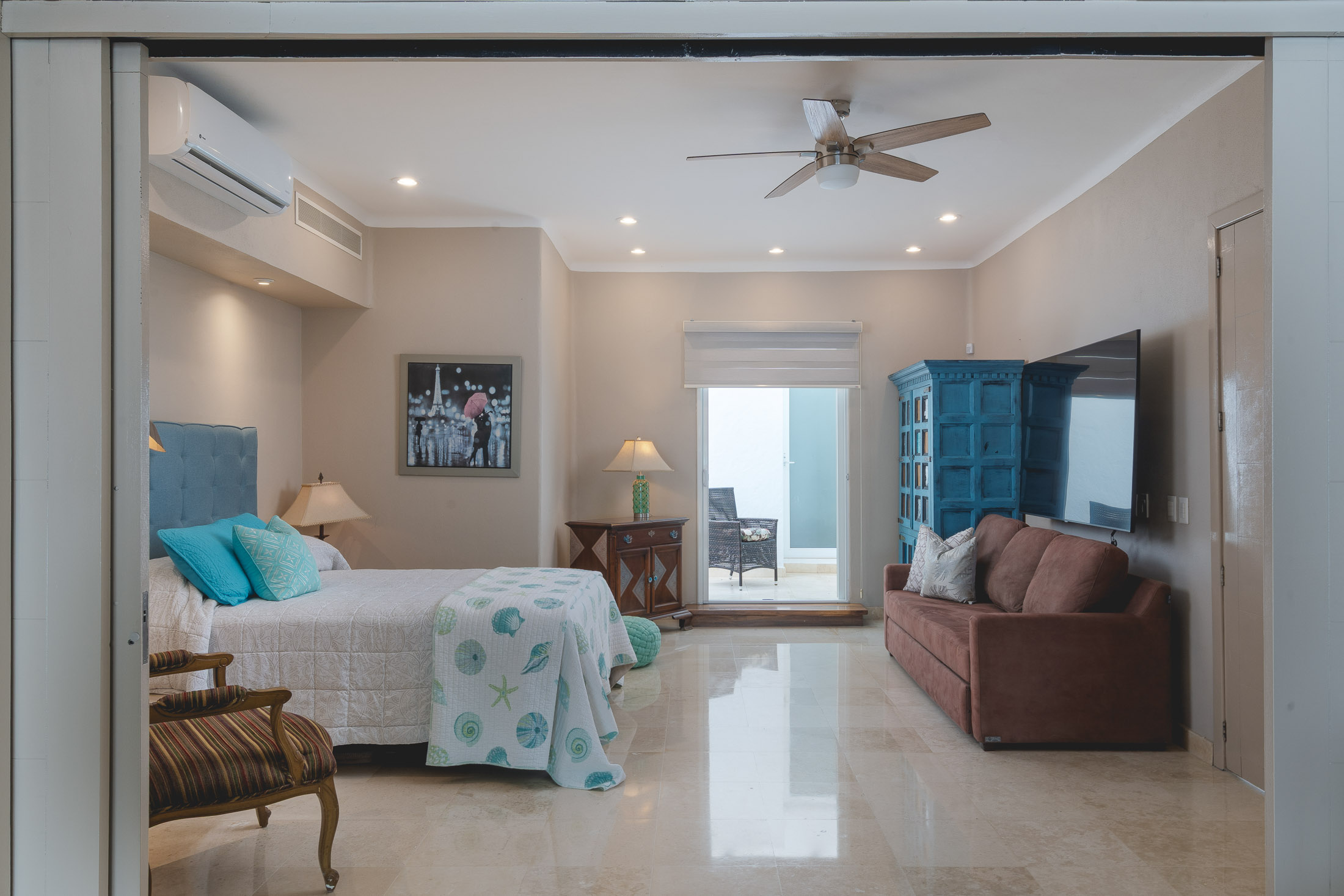 • BEDROOM #5: Separate Studio Suite Apartment, spacious bedroom, balcony overlooking courtyard & fountain.