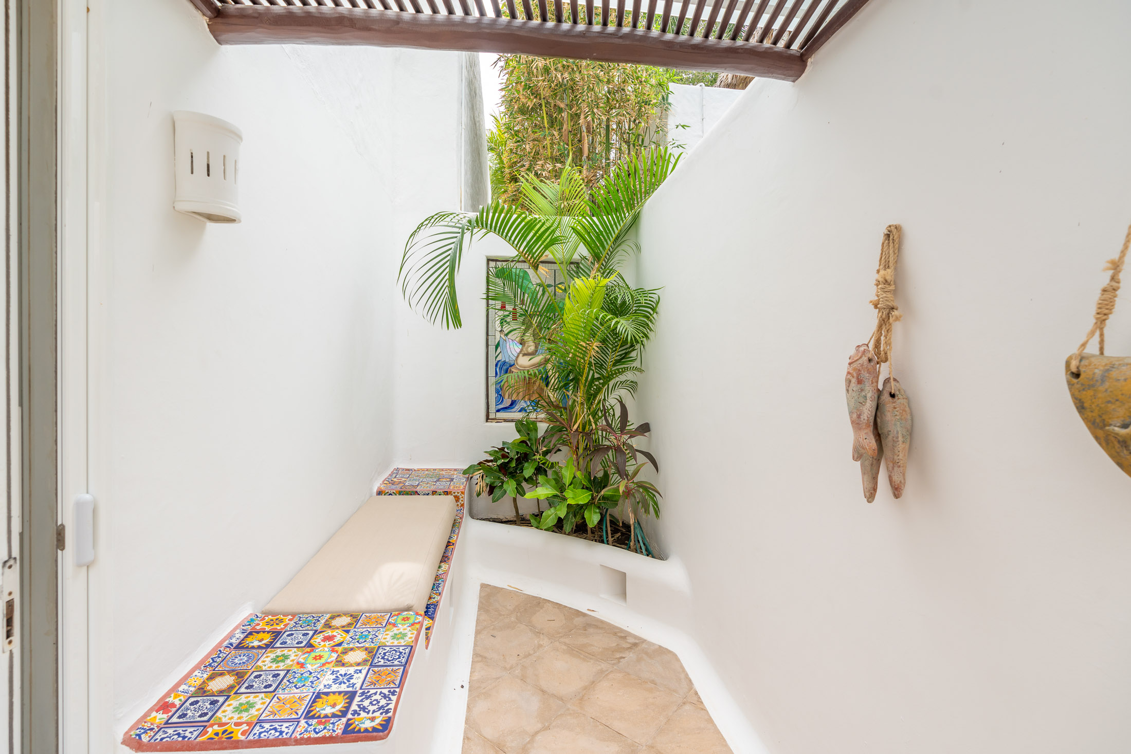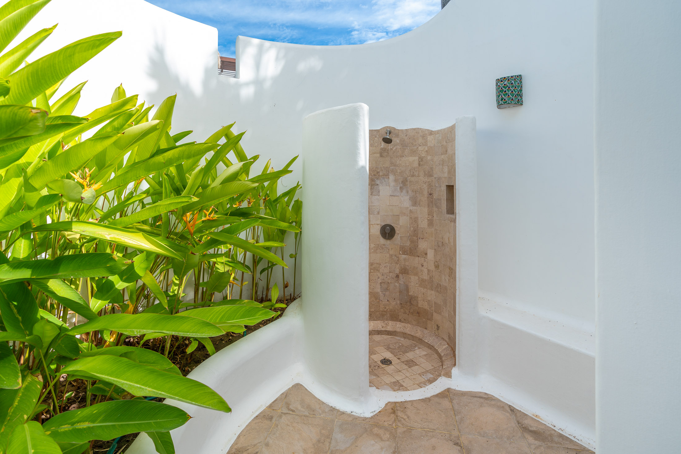 • BEDROOM #2: Spacious Guest Suite & Private Covered Courtyard, indoor & outdoor shower, tiled benches, tropical flower planter
