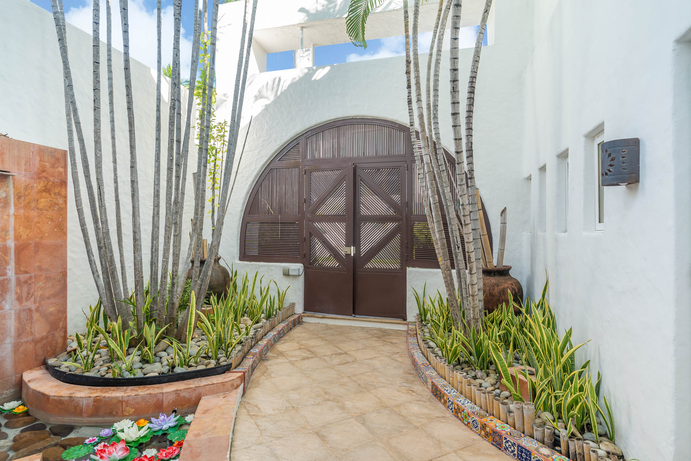 • FRONT ENTRY COURTYARD: Fountain & Lily Pond, custom tiled curbing
